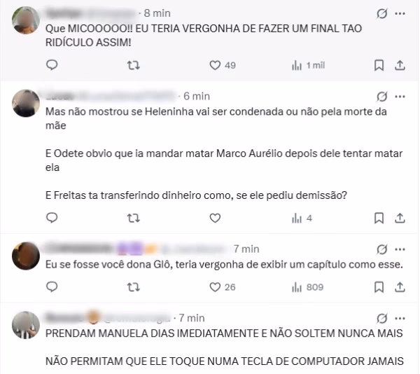 “Eu, se fosse você, dona Glô, teria vergonha de exibir um capítulo desses”, escreveu um usuário revoltado. Outro foi mais direto: “Que mico! Eu teria vergonha de fazer um final tão ridículo assim”.