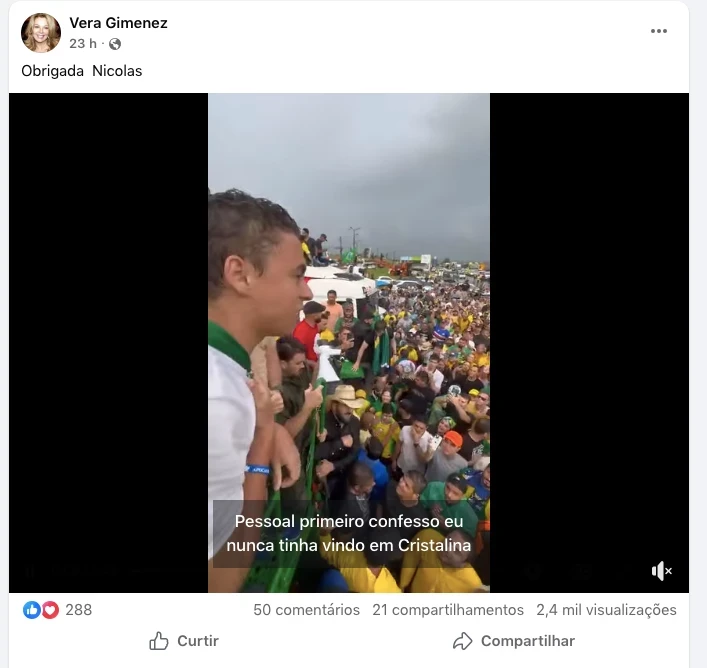 Já na quarta-feira (21), Vera voltou a se manifestar. Desta vez, publicou um vídeo do deputado Nikolas Ferreira e foi direta na legenda, sem rodeios nem discursos longos: “Obrigada, Nikolas”. A mensagem curta, mas carregada de significado, foi interpretada por seguidores como um gesto claro de apoio ao parlamentar e à causa defendida na caminhada.
