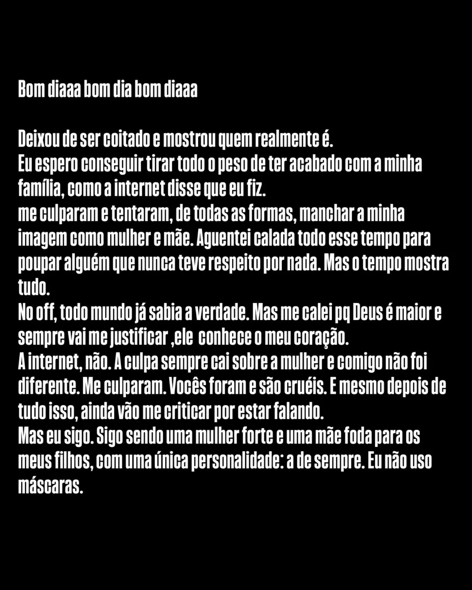 “No off, todo mundo já sabia a verdade. Mas me calei porque Deus é maior e sempre vai me justificar”, disse. Ela também afirmou que segue sendo a mesma pessoa, sem máscaras, e reforçou que continua focada nos filhos.