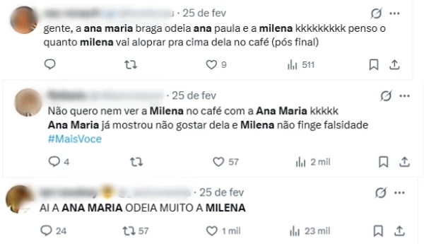 Em poucos minutos, o comentário já circulava nas redes. No X (antigo Twitter), internautas começaram a se dividir. Alguns fãs de Milena consideraram a fala desnecessária, até um pouco implicante. “Ana Maria já demonstrou não gostar da Milena”, escreveu uma usuária. Outro perfil disparou: “A Ana Maria odeia muito a Milena”. Teve ainda quem pedisse mais respeito com a participante, reforçando que ela tem todo direito de impor limites, principalmente em um ambiente de confinamento intenso como o do BBB.